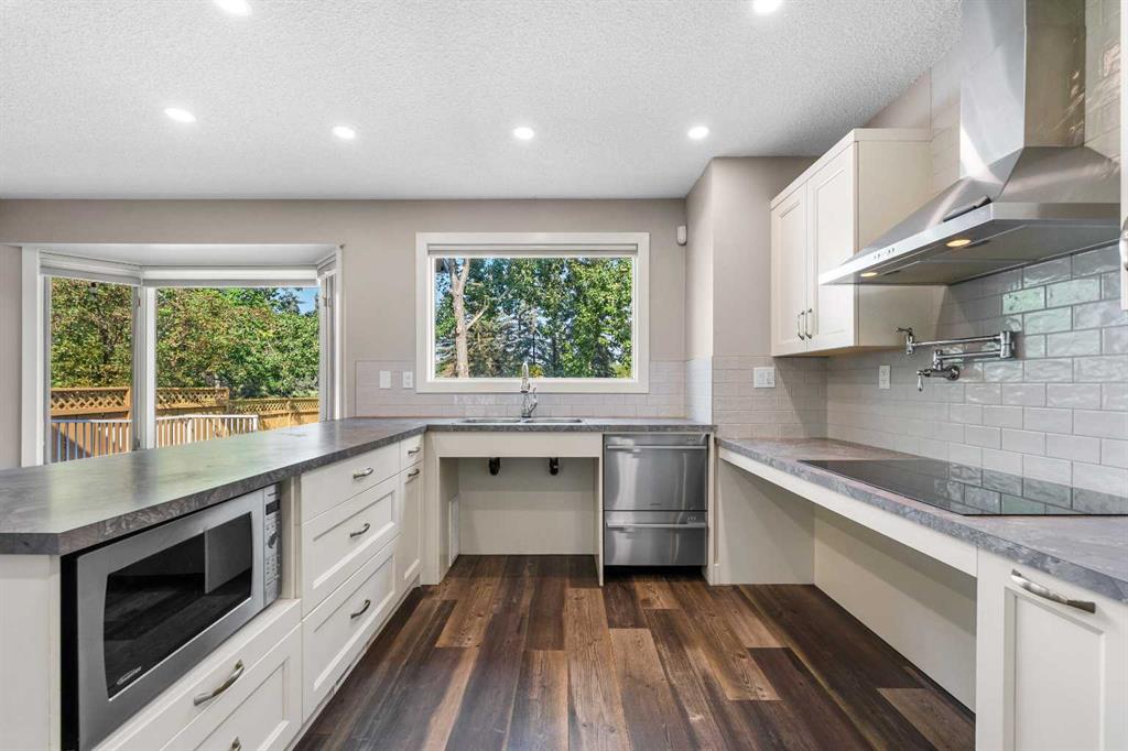 The kitchen is both stylish and highly functional, offering white cabinetry, generous storage, a subway tile backsplash, and a full suite of stainless steel appliances. An upgraded induction cooktop with pot filler, wall oven, and large French-door refrigerator provide all the conveniences of a chef’s kitchen, while the built-in microwave, breakfast bar, and dedicated casual dining space make it perfect for everyday living. Large picture windows frame views of the backyard and green space beyond, creating a bright and welcoming environment for cooking, dining, or gathering with friends and family.