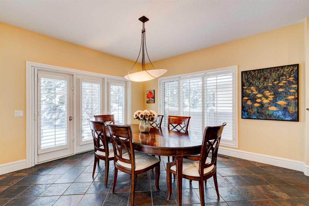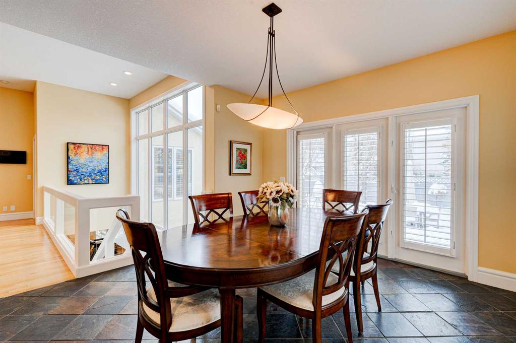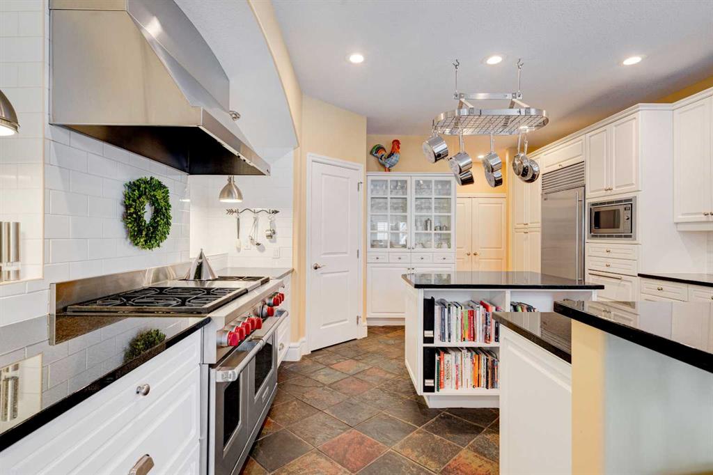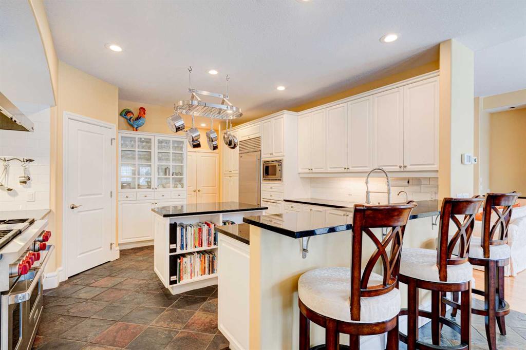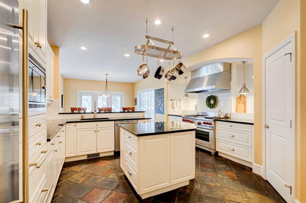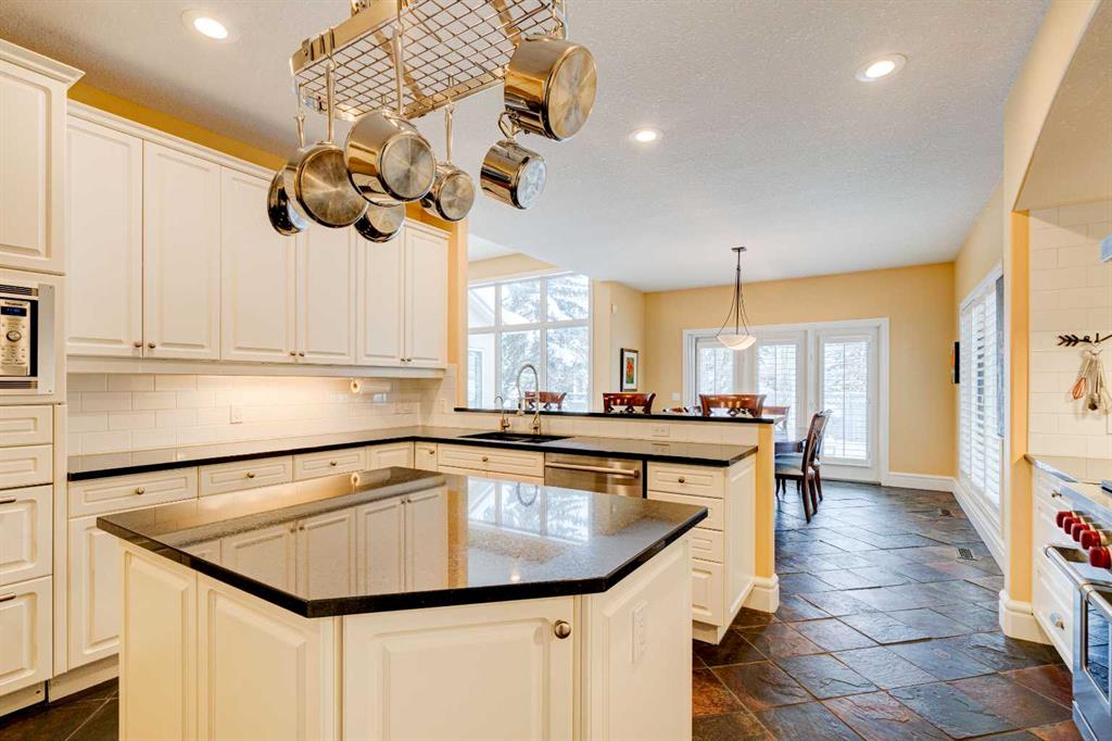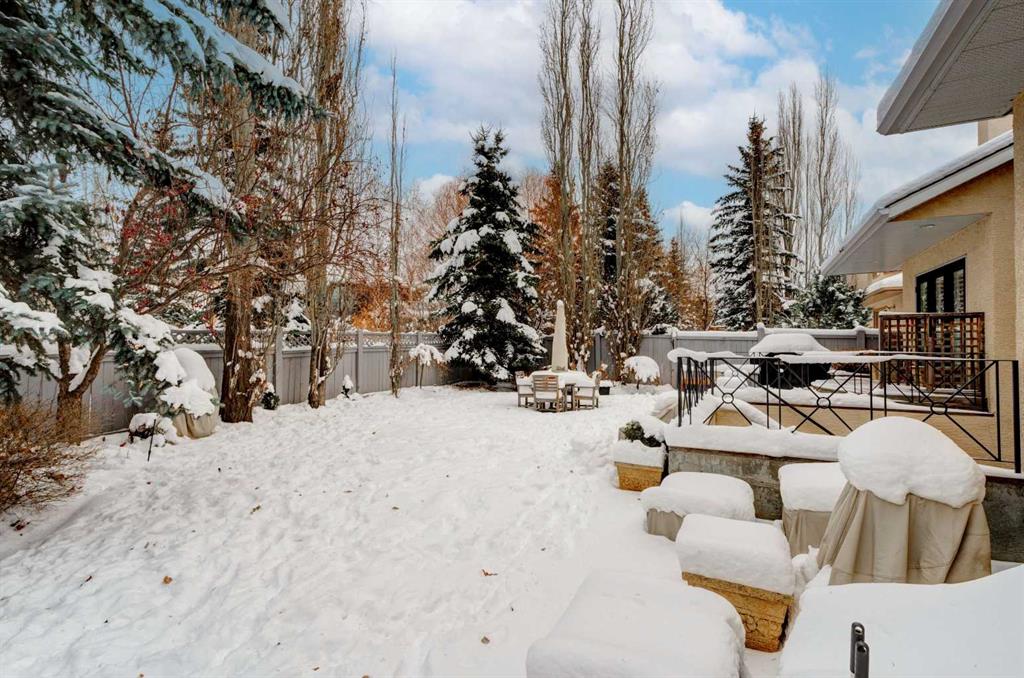 5 BEDROOMS | 3 BATHROOMS | BUNGALOW | 3,500 SQFT OF LIVING SPACE | HIGH CEILINGS | DOUBLE ATTACHED GARAGE | Welcome to this stunning bungalow on the sought after street of Schiller Crescent in the community of Scenic Acres. With over 3,500 sq ft of living space and 5 bedrooms, this home offers an abundance of room to live and entertain. You will be impressed with the attention to detail in the home with oak hardwood and slate floors, large wood baseboards, curved walls, 11′ high ceilings, and custom shutters throughout. Upon entering through the oak front door, you’ll be greeted by a large foyer inviting you into the spacious great room with views to the back yard. The great room is the focal point of the home and features unique columns, a granite surround fireplace, birds eye maple built in cabinetry and architectural curved walls and ceiling adding to the home’s grandeur. The gourmet kitchen is a chef’s dream, featuring custom cabinetry, granite countertops, breakfast bar, prep island, 48″ Wolf gas range, Subzero fridge, Subzero fridge drawers, and spacious pantry. Enjoy the spacious adjacent dining room, the perfect setting for hosting memorable gatherings. Head outside from the dining room to continue entertaining on the large stone patio with mature trees providing privacy all around you. The stunning master bedroom is an oasis of tranquility and features a 5-piece ensuite with heated floors, granite counters, custom cabinetry, Bain Ultra tub with self drying feature and upgraded plumbing fixtures. The main floor features a second bedroom that can also be used as an office with custom file drawers and shelves. Second bathroom features carrera marble 3-piece bath. The mud and laundry room contain ample storage and granite countertops. As you make your way downstairs, you will be further impressed with the additional amount of living space and the architectural details carried through the home. The family room is flooded with natural light from the large windows continuing from the floor above and opens onto a large exercise room with floor to ceiling mirrors. The basement also includes 3 additional bedrooms with closets and a 3-piece bathroom with luxurious steam shower with bench, heated floors and heated towel bars offering versatility and ample space for guests or growing families.The features of this home continue with vacuflo throughout, 2 furnaces, 2 hot water tanks, super sump pump with backup battery and rough ins for water softener and basement washer/dryer. The fully fenced backyard is an oasis to entertain with a large cedar deck, 2 stone patios, stone walkway, irrigation and hot tub. This beautiful home must be seen with its prime location within Scenic Acres, quick access to Stoney Trail, neighbourhood schools, Crowfoot Centre & the LRT. Book your showing today!