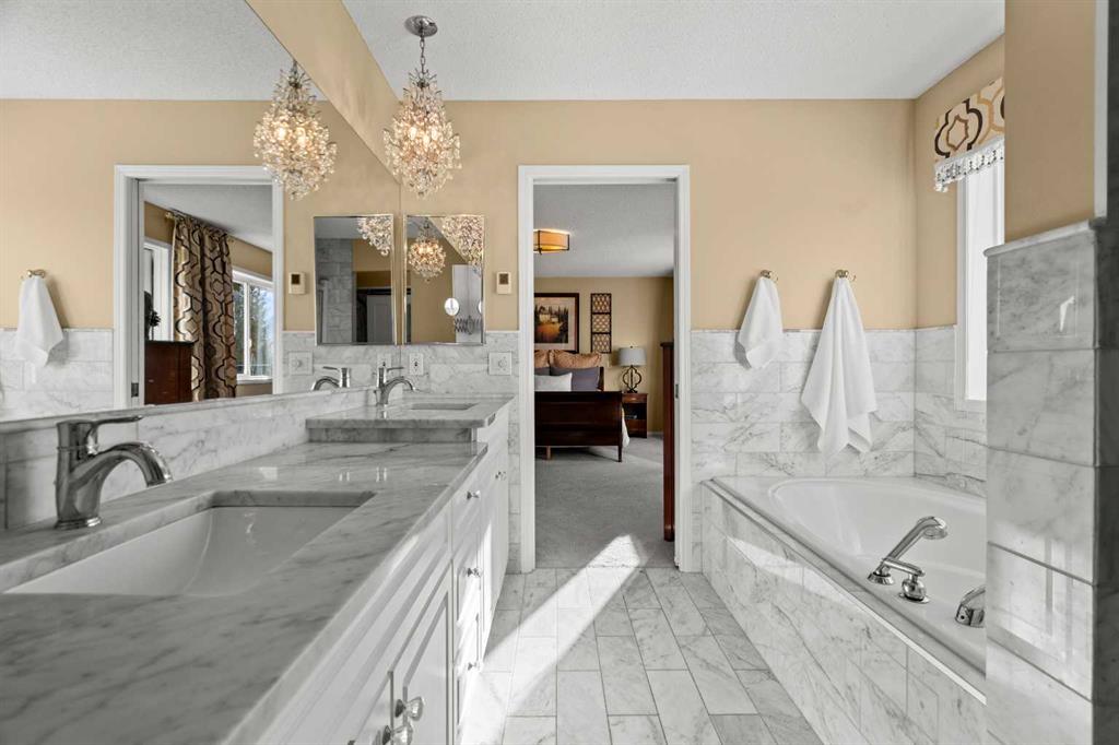 Upstairs, you’ll find four bedrooms, including a stunning primary suite with a 5-piece spa-inspired ensuite with in-floor heated marble floors, a large walk-in closet and beautiful mountain views. Just off the primary bedroom is a balcony to enjoy your morning coffee, the view and scenery. This level also includes an additional 5-piece bathroom with skylight and dual vanities and in-floor heated marble floors – comfort for the whole family.